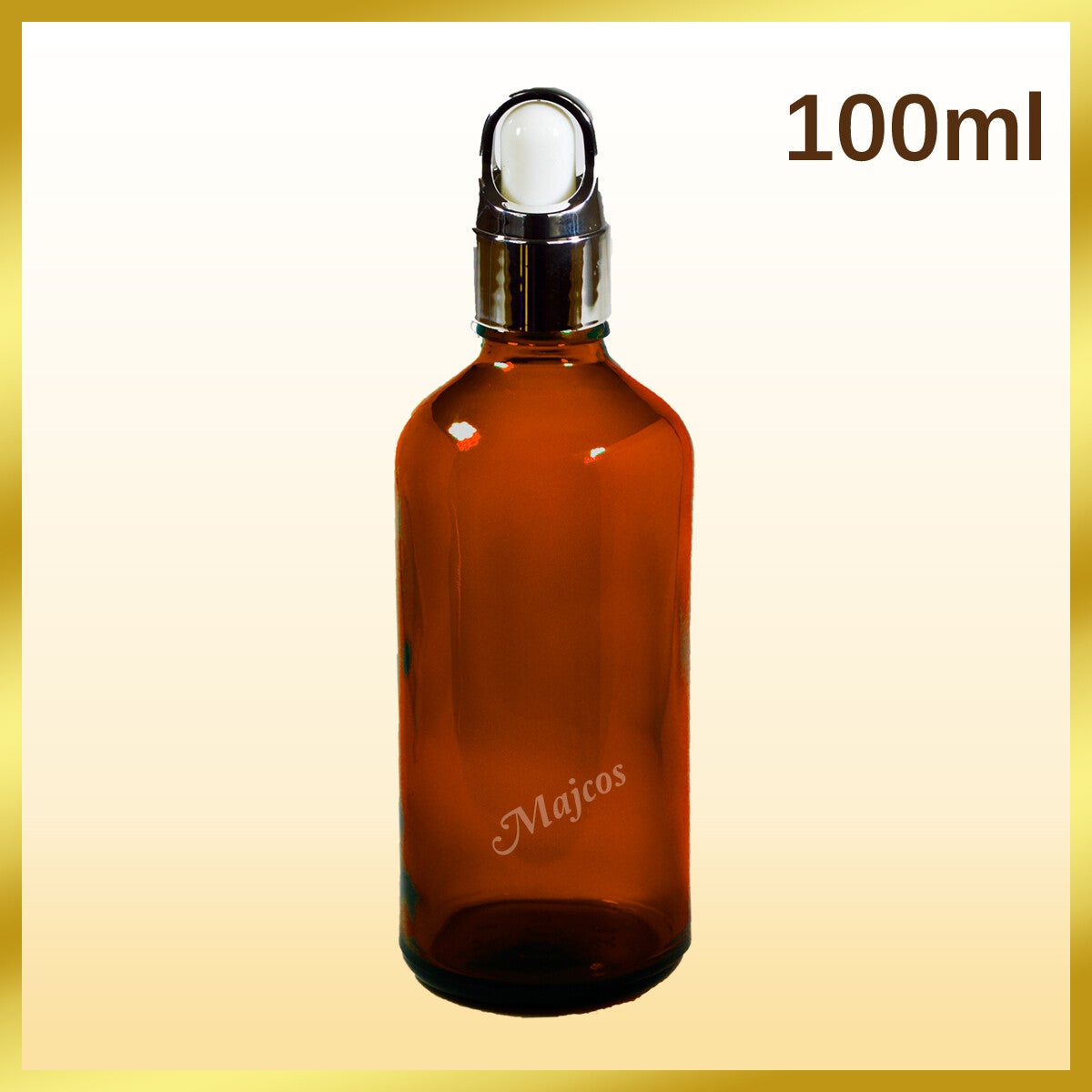 High quality 100ml aromatherapy empty Amber Glass Bottles supplied with high quality Silver Flower Basket White Top Glass Pipette for easy dispensing desired dosage used for Essential Oils, serums, Perfumes, Fragrance Oils, Massage oils, Bath Oils, Nail Oils and Oral applications giving the content full UV light protection.