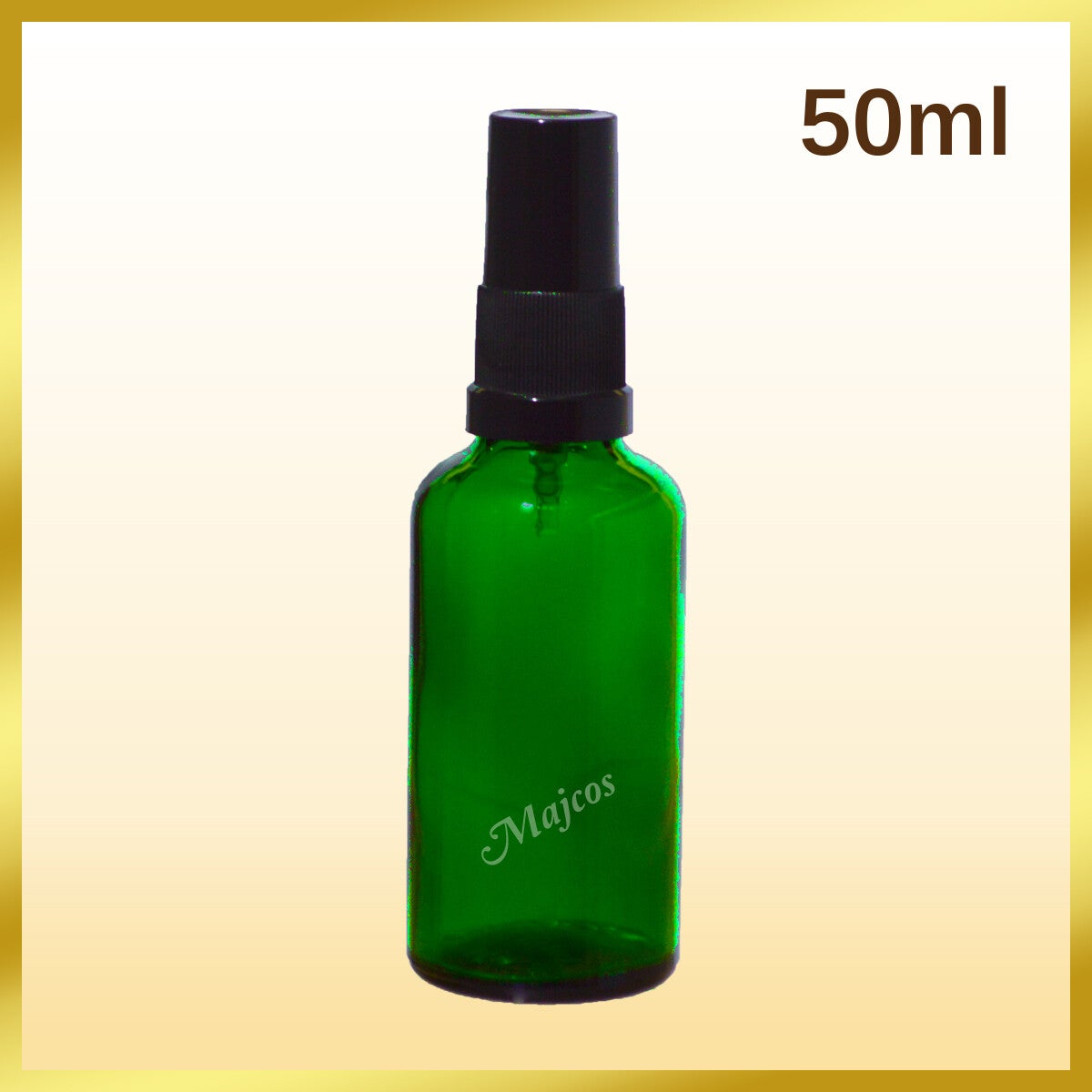 High quality 50ml aromatherapy empty Green Glass Bottles supplied with new improved Design Leak proof Tamper evident Black Plastic atomizer / fine mist spray for easy even applications used for Essential Oils, serums, Perfumes, Fragrance Oils, Massage oils, Bath Oils, Nail Oils and etc. giving the content full UV light protection.