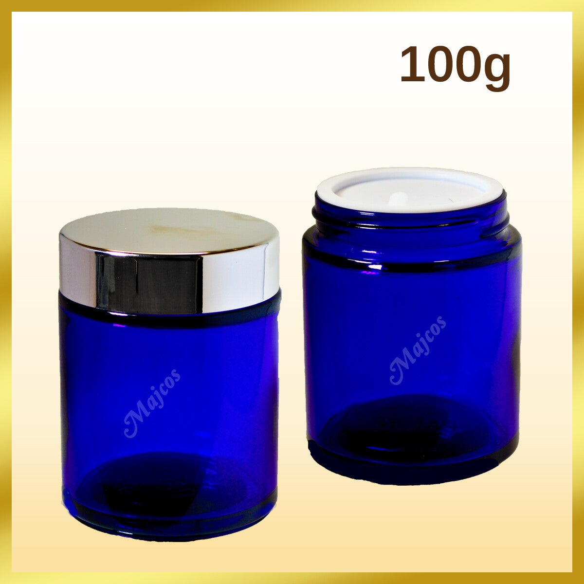 High quality 100g real Cobalt Blue Glass Jars supplied with shiny Silver screw caps and inner white Liner convenient to carry and storage for Skin care items like Facial Cream, Body Cream, Lotions, Masks, Palms & Scrubs.