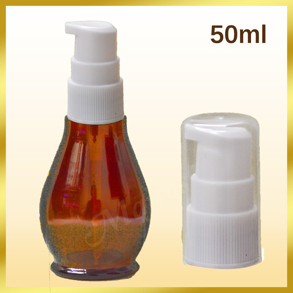 High quality50ml aromatherapy empty Amber Gourd Glass Bottles supplied with White treatment Cream Lotion Pump for easy dispensing desired dosage for Creams and Lotions giving the content full UV light protection applications.
